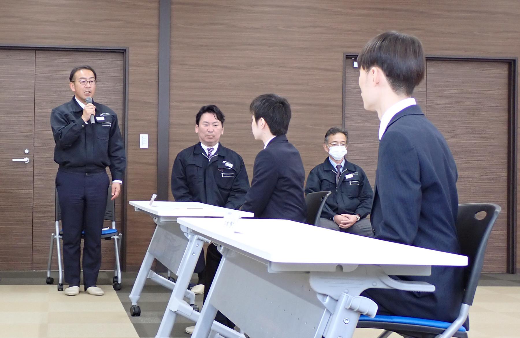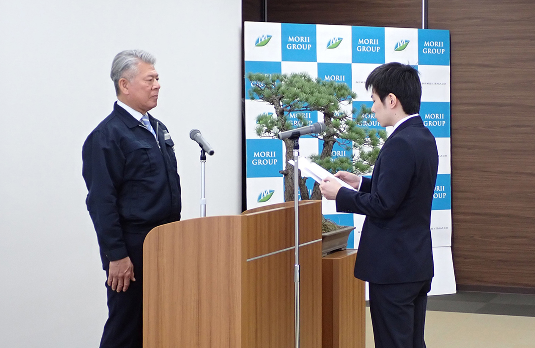 式典は、森井社長による式辞からスタートしました。 社長からは、これからの森井紙器工業を担う新しい力への期待と、社会人として一歩を歩み出す上での心構えが語られました。