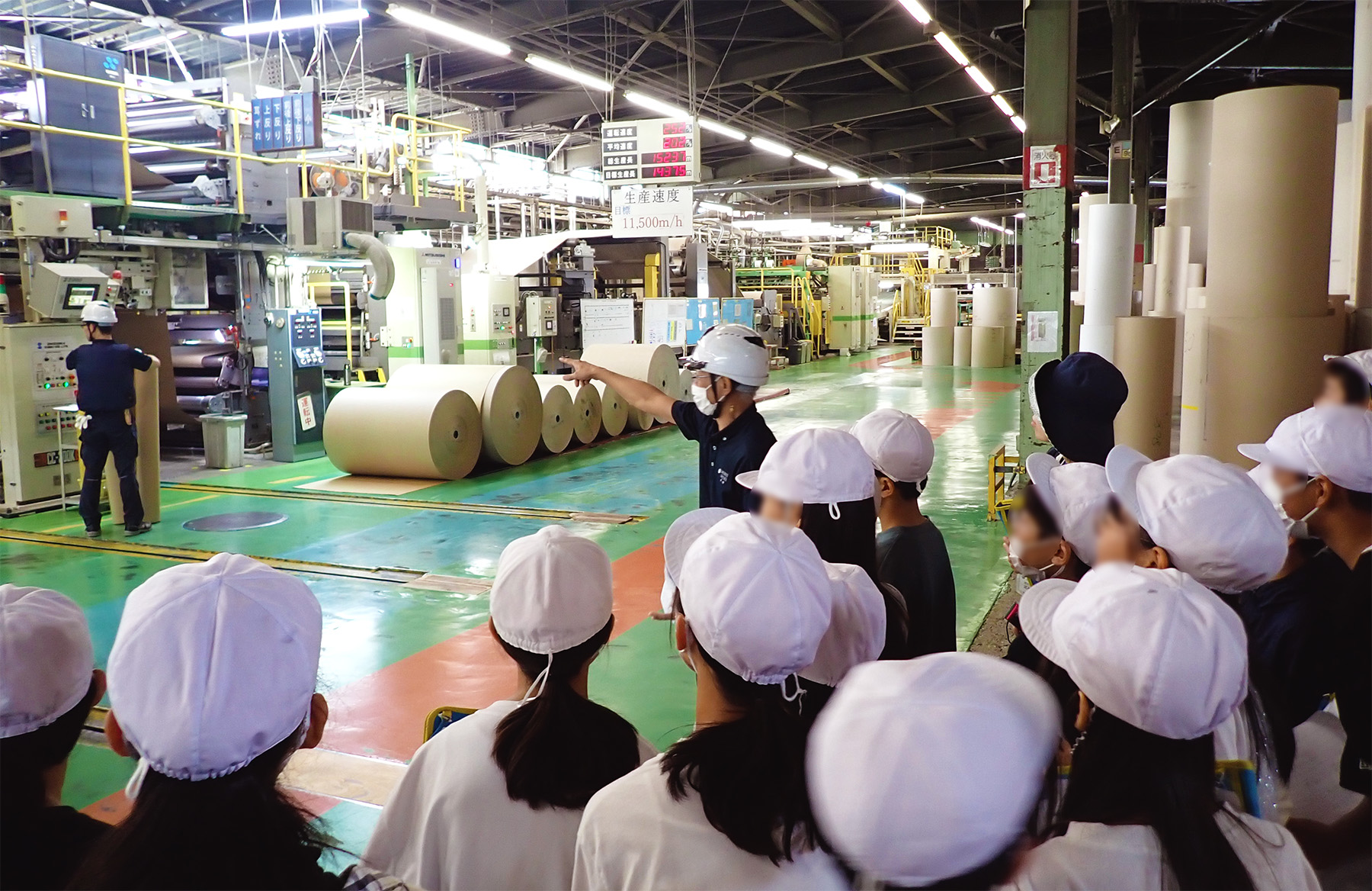 見学当日は、短い時間ながらも、工場内を案内し、段ボールの仕組みについての講座も行いました。児童の皆さんからは多くの質問が寄せられ、段ボールや工場の設備、そして「働くこと」への関心が強く感じられました。