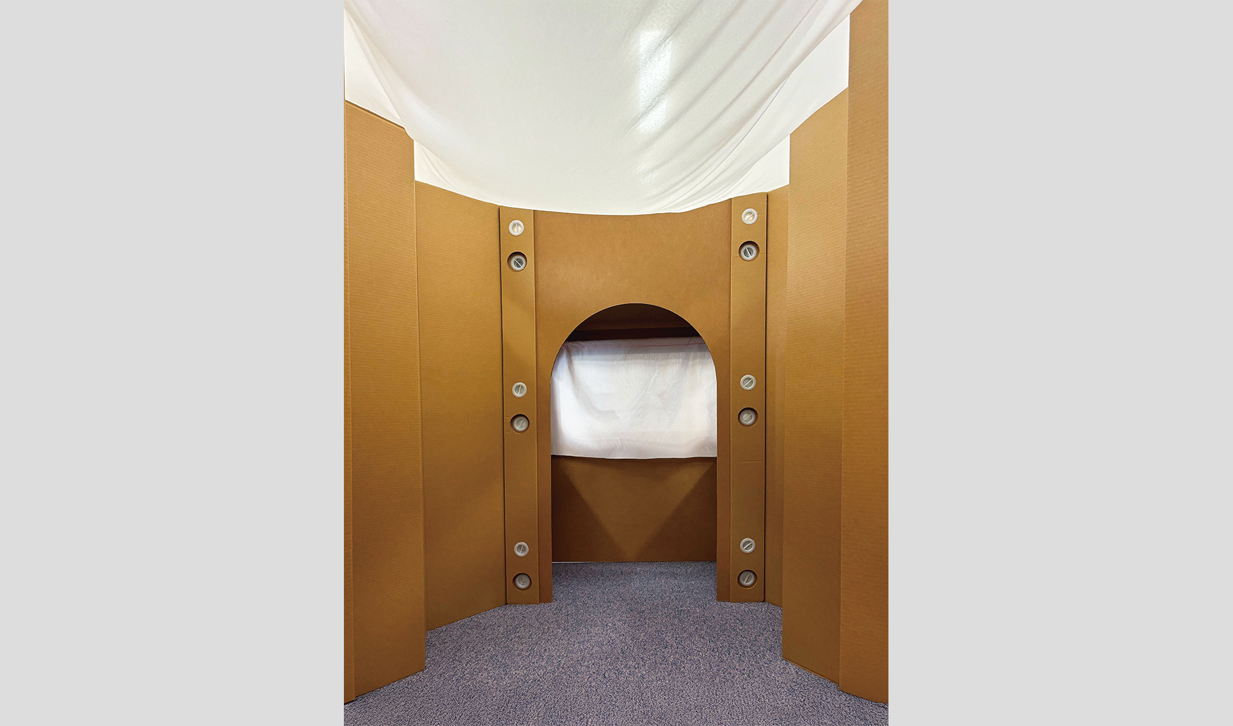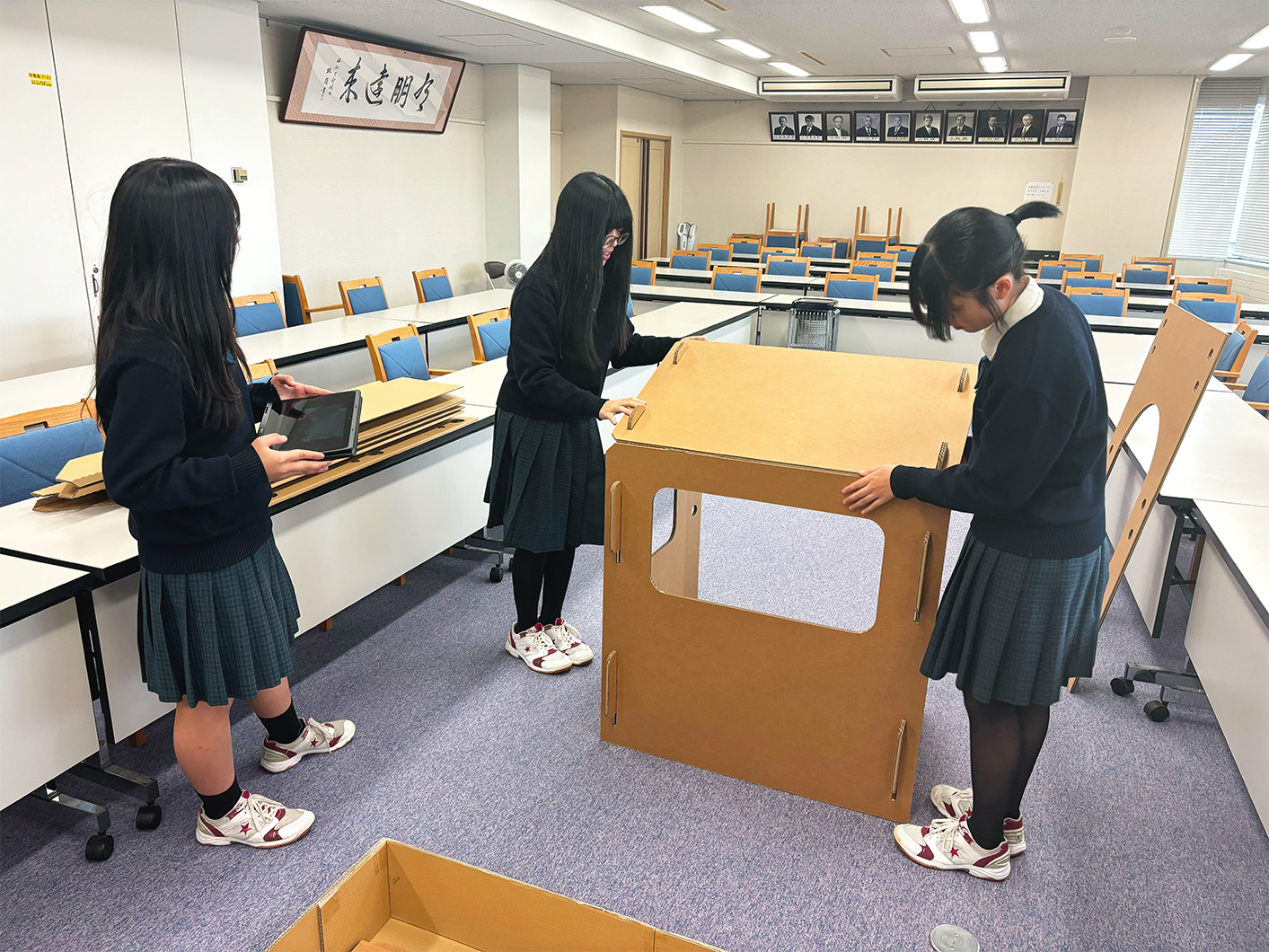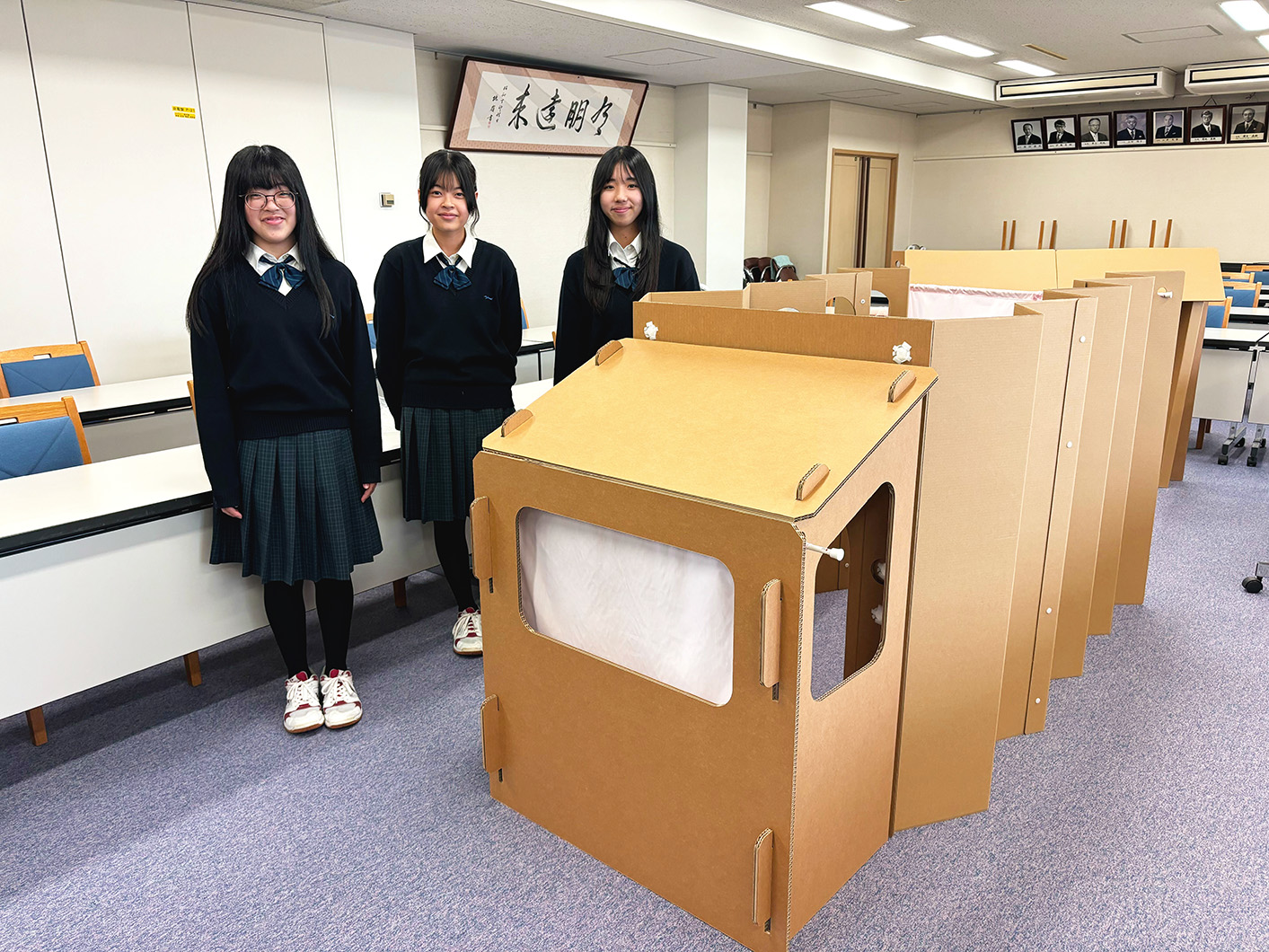 今年度生徒達は『災害時でも大人も子供も心のゆとりを持つことができるスペースを作る』をテーマに、ダンボールを主な素材とし、家政科ならではの布を用いて、創造性あふれる作品を作り上げました。