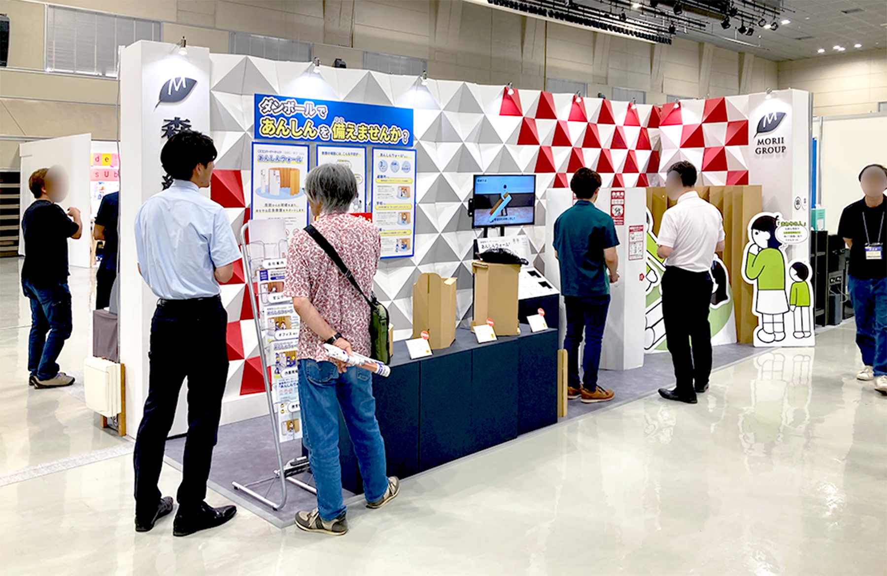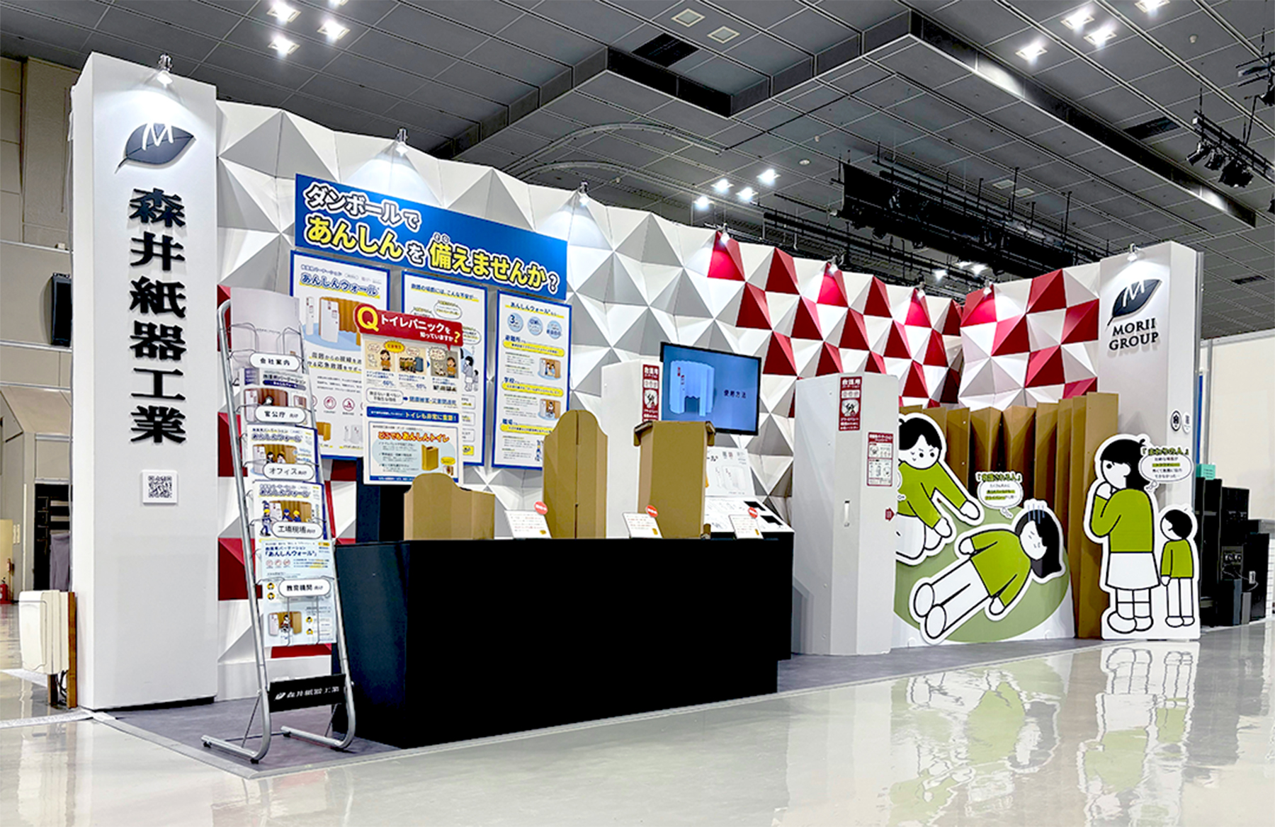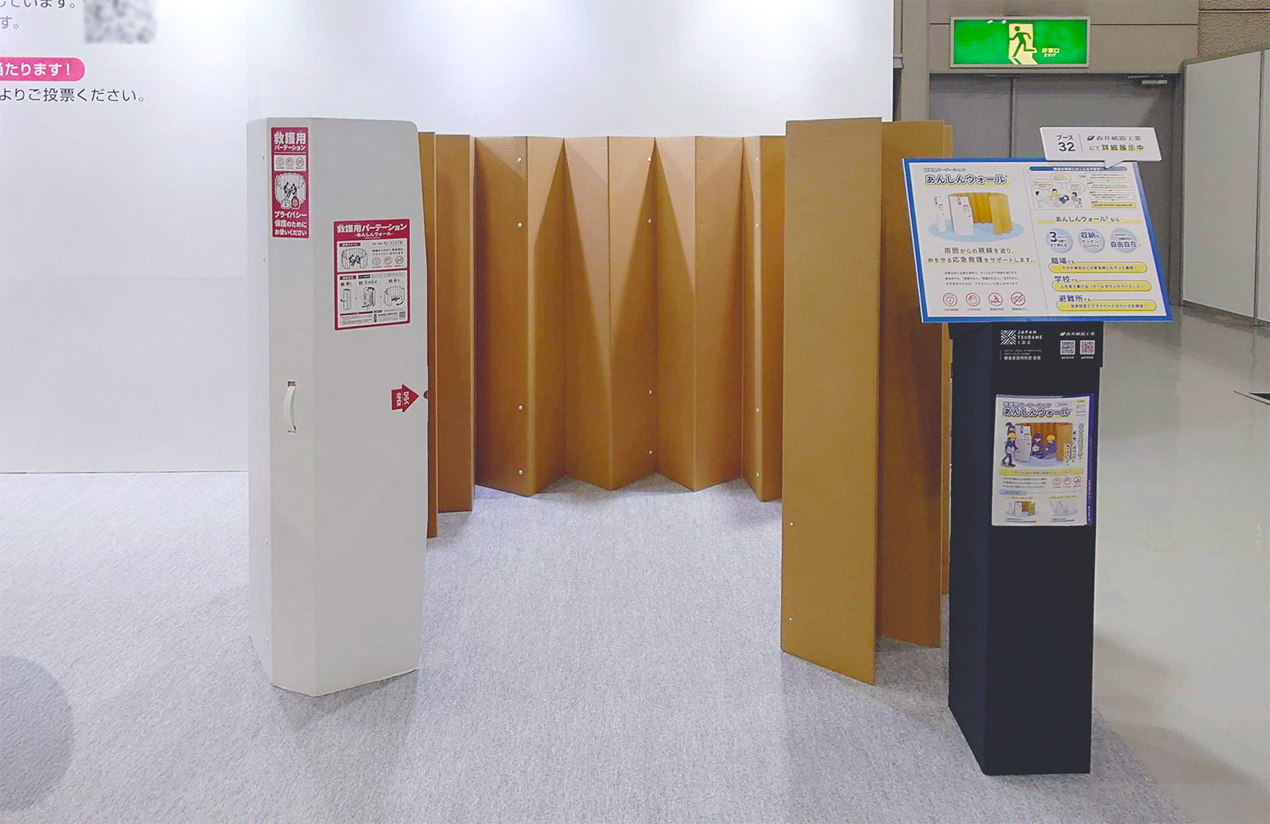 当社のブースでは、災害時にも役立つ救護用パーテーション「あんしんウォール」など、段ボール加工技術を活かした防災関連製品を展示しています。