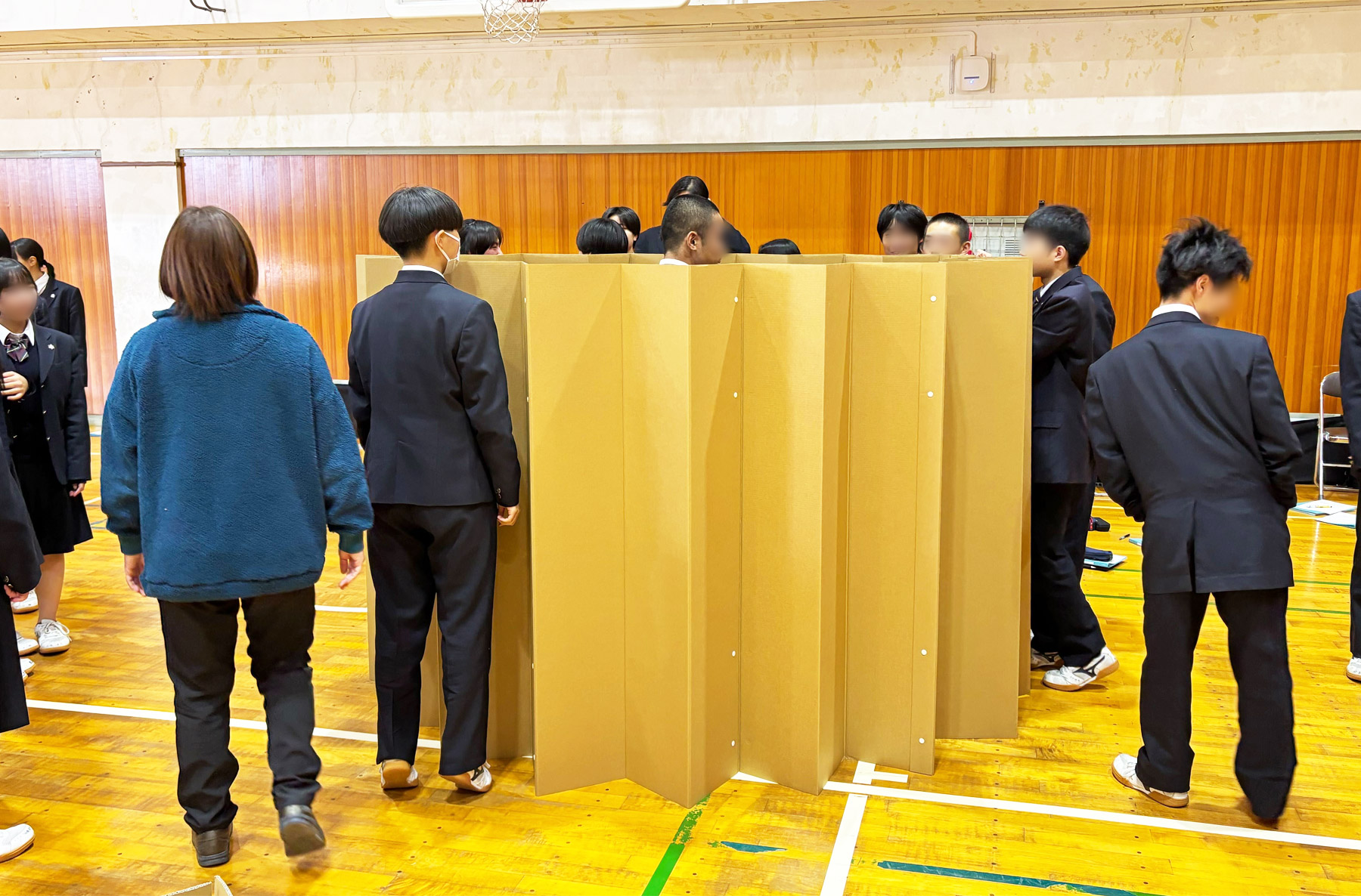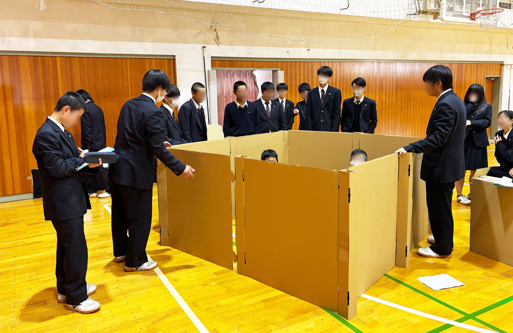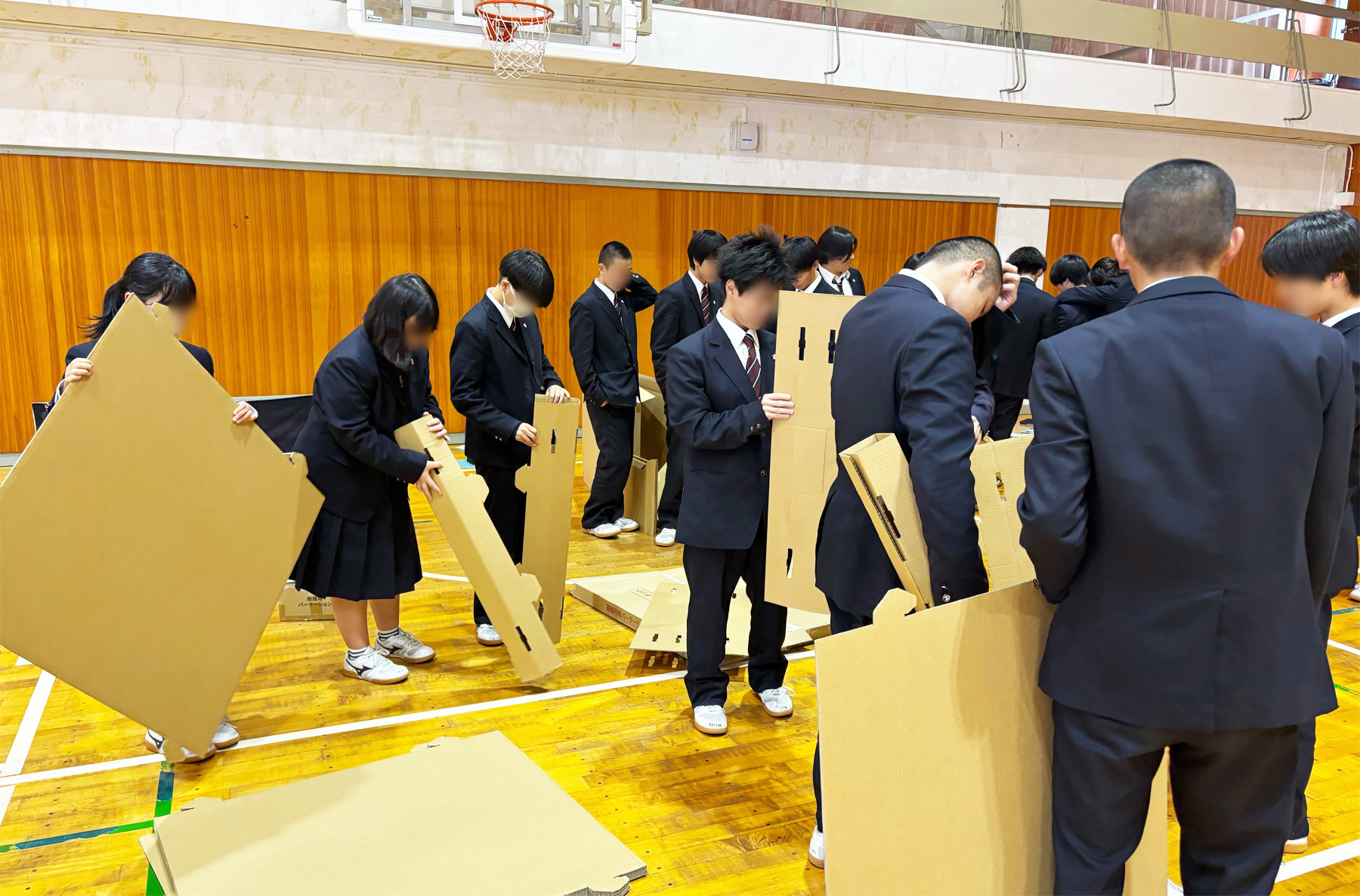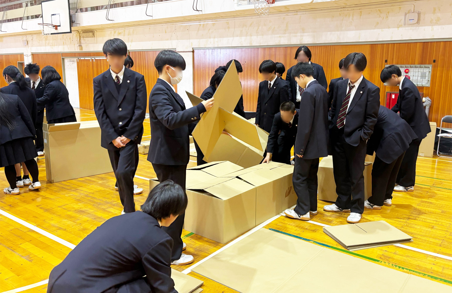 講義では、当社の紹介に続き、段ボールの強度や特長、段ボール製防災用品について説明しました。そのうえで、避難所で生じる課題と、それらをどのように防災用品で解決できるのかを紹介し、実際に生徒全員に段ボールベッドや避難所用パーテーションを組み立ててもらいながら、段ボールの特長を生かした防災用品を体験していただきました。