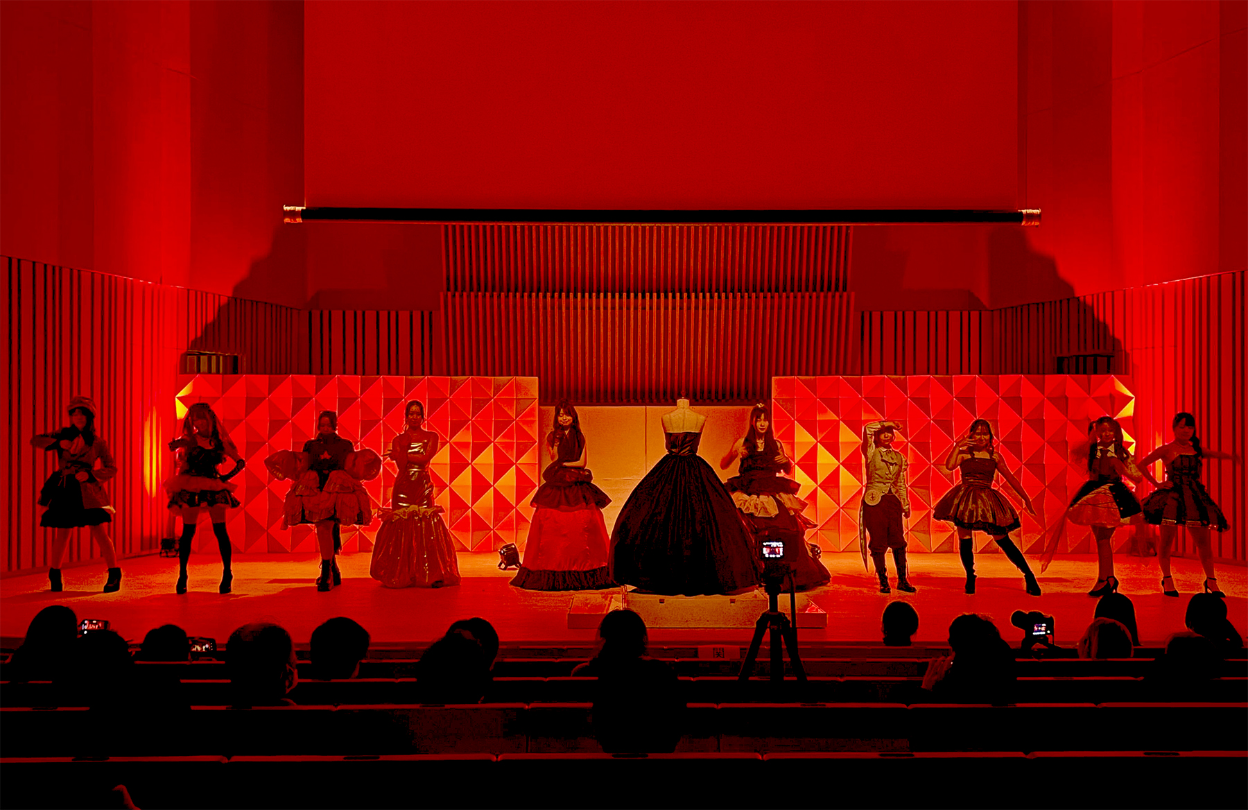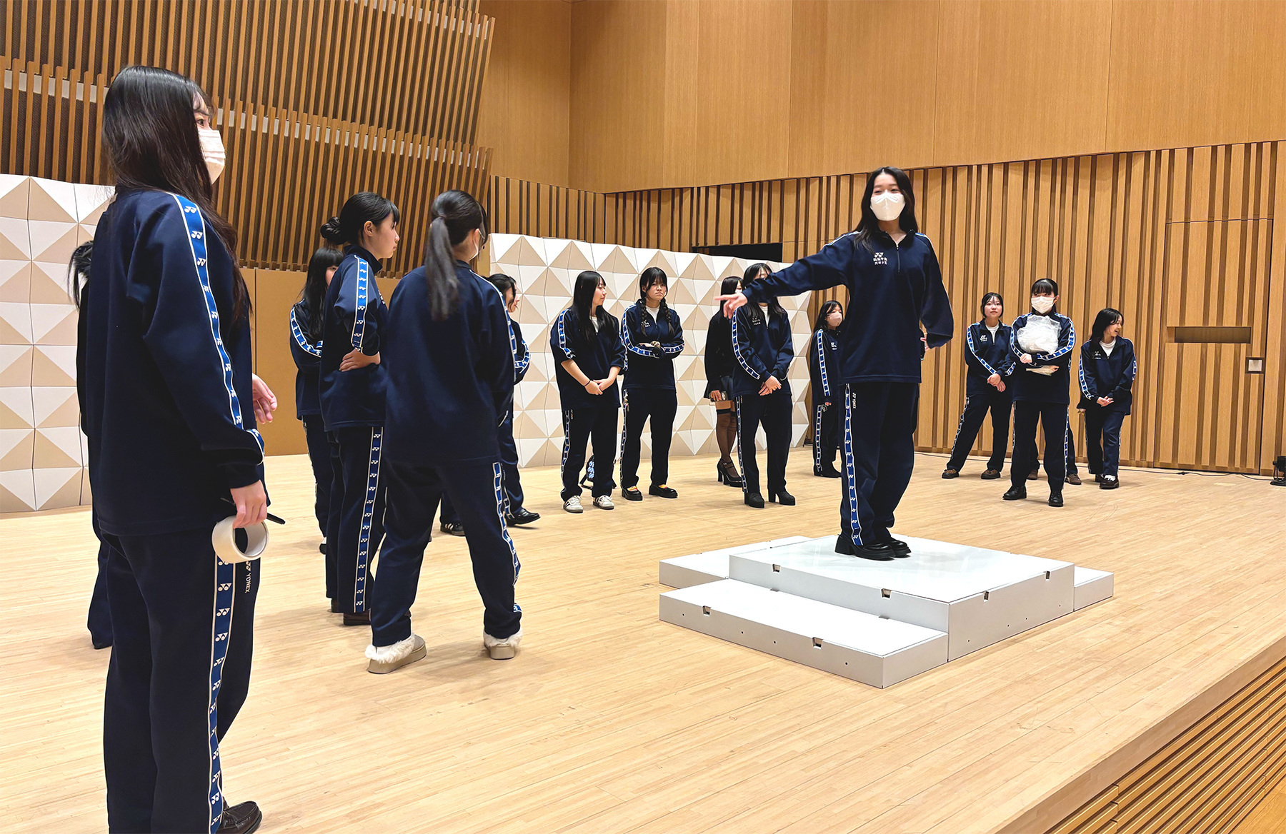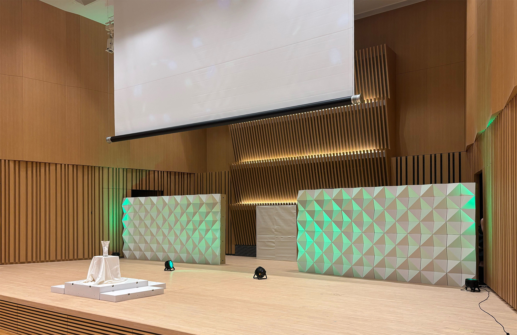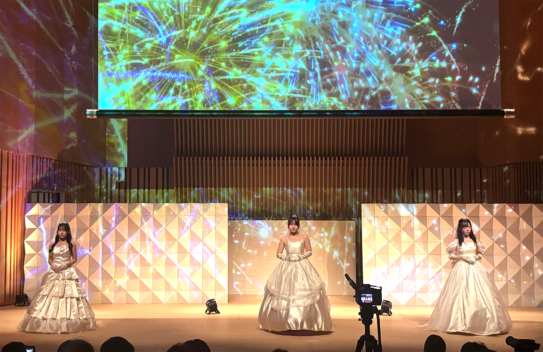 お立ち台は、基本ベースを段ボールで製作し、天板のみ化粧板を使用することで、丈夫さと軽量性を兼ね備えた仕様となっており、ショーの進行中もさまざまな場面でご活用いただきました。