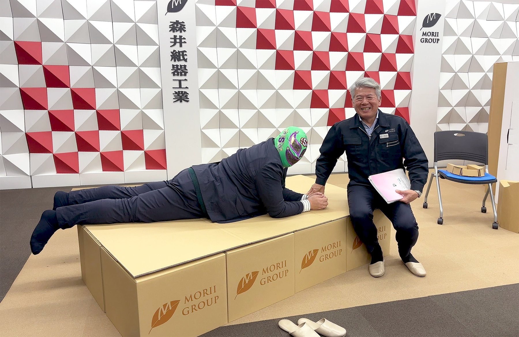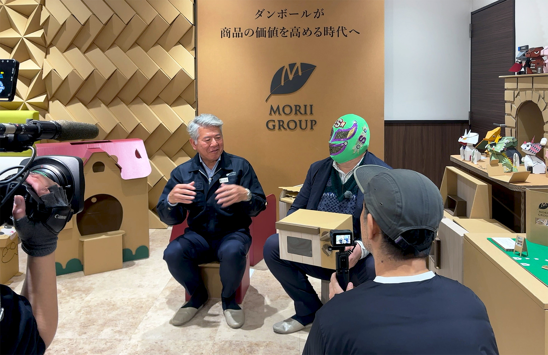取材では森井社長がインタビューに応じ、「段ボール箱」をはじめ、地域の安全を支える防災関連製品、さらには子どもたちの創造力を育む段ボールグッズなど、当社の多様な製品ラインナップをご紹介しました。